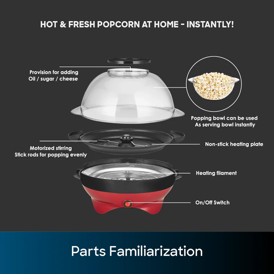 Description High-capacity popcorn maker with oil-free popping, powerful heating, motorised stirring, detachable non-stick plate, and dual-purpose lid. Suitable for popcorn and coffee bean roasting.